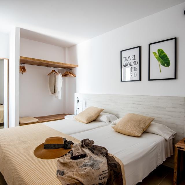 Je vindt Es Pujols Apartments in het hart van de gelijknamige stad Es Pujols, op het Spaanse eiland Formentera. De ruime appartementen zijn smaakvol ingericht, met lichte kleuren en natuurlijke materialen. Sla ’s morgens de gordijnen open en voel hoe de eerste zonnestralen je wangen verwarmen. Er is geen betere manier om de dag te beginnen. Ieder appartement heeft een goed uitgeruste kitchenette; perfect om zelf een ontbijtje te verzorgen. Heb je geen zin om tijdens de vakantie in de keuken te staan? Schuif dan aan in het café van het complex waar dagelijks heerlijk vers ontbijt wordt geserveerd. Daarna kun je op dit eiland alle kanten op. Wandel in twee minuten naar het prachtige strand, of neem een kijkje in de levendige winkelstraat met gezellige bars en restaurants. Alles is binnen handbereik. Ga lekker aan het zwembad liggen, of leen een fiets bij de receptie. Wist je dat er maar liefst 28 fietsroutes zijn op Formentera? Laat je verwonderen door de natuur, de rust en de ruimte. Wees voorbereid: Als je dit eiland eenmaal hebt ontdekt, kom je hier zeker vaker terug.