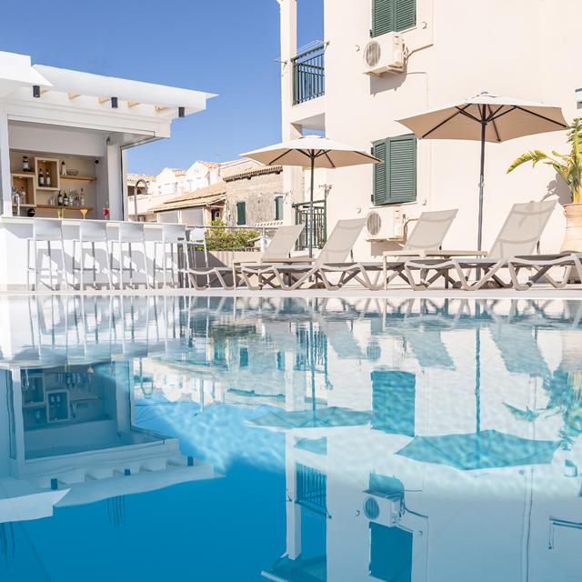 Appartementen Ippocrates is een knus en kleinschalig complex op een fantastische locatie. Zodra je hier het terras afloopt, sta je vrijwel direct op het strand van Achavari. Nieuw deze zomer zijn het heerlijke zwembad en de poolbar. Beide perfect om even af te koelen en te relaxen. Neem af en toe een verkoelende duik, geniet op je ligbed van het mooie weer en bestel je favoriete drankje.