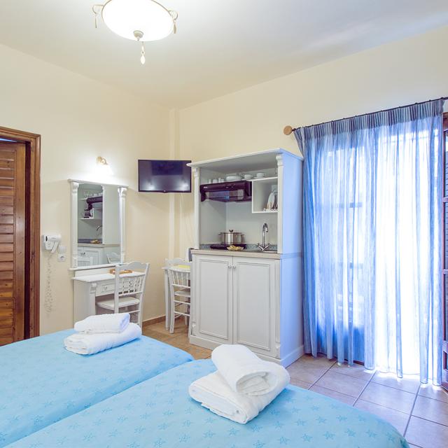 Appartementen Marouso is een 3 sterren accommodatie, warm en stijlvol ingericht. Je verblijft in een comfortabele , ingericht met aandacht voor detail. Het bed ligt goed, de ruimte is licht, en het balkon of terras nodigt uit om te blijven zitten.