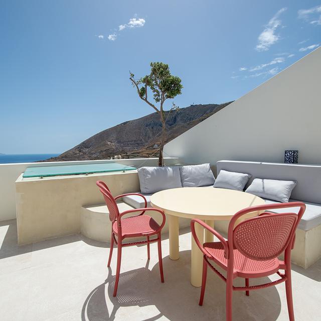 Atria Suites is een splinternieuwe parel in het rustige hart van Santorini, met slechts drie elegante suites die Cycladische charme combineren met hedendaags comfort. Alle verblijven hebben een eigen jacuzzi met uitzicht op zee. De locatie is ideaal: ver van de toeristische drukte, maar op een steenworp van het levendige Kamari en de stranden – een zeldzaamheid op het eiland. Gastheer Antonis verwelkomt je met vers fruit en een glimlach, en deelt graag zijn tips om het eiland als een local te verkennen. Hier ervaar je het echte Griekse leven, op een plek waar niets moet en alles mag.