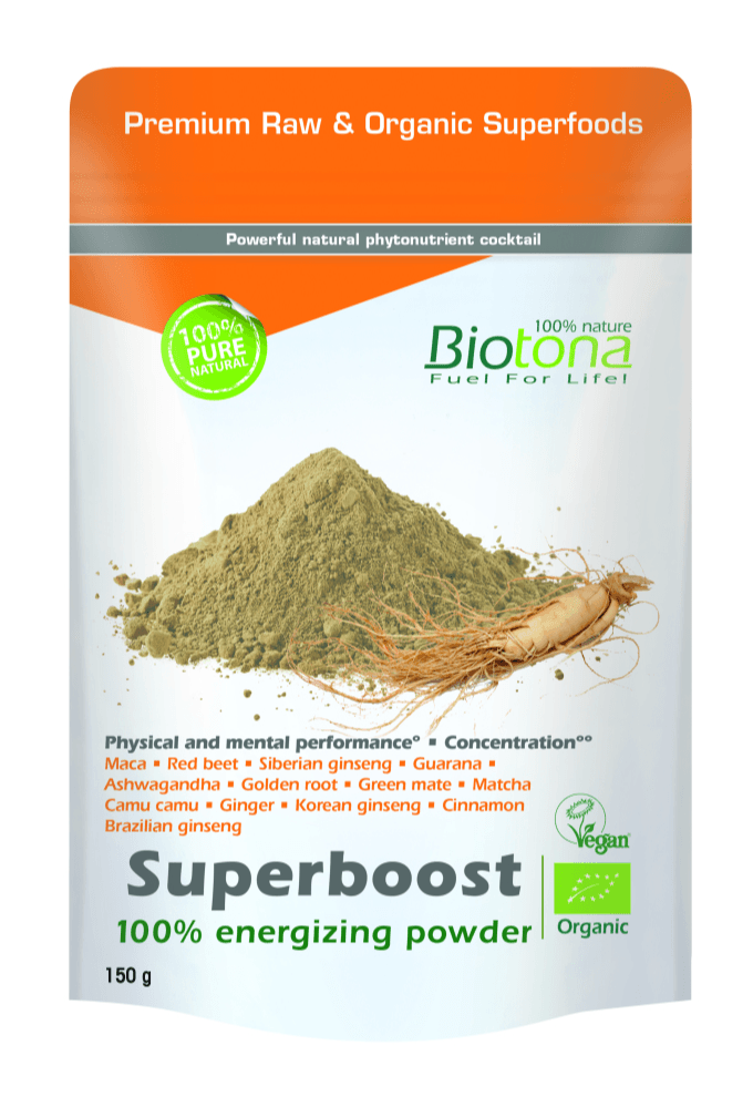 Je weet hoe het gaat. Je wilt goed voor jezelf zorgen, maar soms schiet het erbij in. Drukke dagen, weinig tijd om op alle details te letten, en toch wil je je lichaam geven wat het nodig heeft. Biotona Superboost Powder van Biotona is een voedingssupplement dat jou hierbij ondersteunt. Geen loze beloftes, maar Biotona Superboost Powder is een vegan voedingssupplement dat verschillende soorten ginseng bevat zoals maca (Peruaanse ginseng), panax ginseng (Koreaanse ginseng), eleutherococcus (Siberische ginseng), ashwagandha (Indiase ginseng) en suma (Braziliaanse ginseng). Panax wanneer jij dat kunt gebruiken.