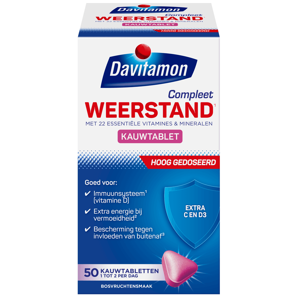 Je weet hoe het gaat. Je wilt goed voor jezelf zorgen, maar soms schiet het erbij in. Drukke dagen, weinig tijd om op alle details te letten, en toch wil je je lichaam geven wat het nodig heeft. Davitamon Compleet Weerstand Hoog Gedoseerd Kauwtabletten van Davitamon is een voedingssupplement dat jou hierbij ondersteunt. Geen loze beloftes, maar Davitamon Compleet Weerstand Hoog Gedoseerd Kauwtabletten ondersteunt de weerstand en bevat alle belangrijke vitamines en mineralen voor een gezond immuunsysteem. Deze hoog gedoseerde kauwtabletten zijn speciaal ontwikkeld voor volwassenen en geven extra ondersteuning wanneer jij dat kunt gebruiken.