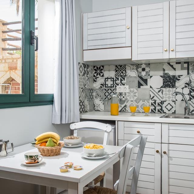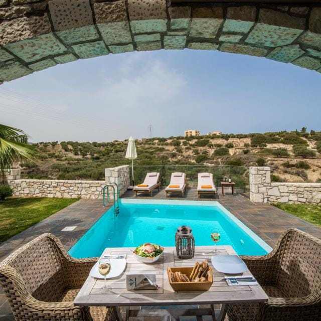 Ik geniet nog even van de sfeer op het plein van Oud-Chersonissos, voordat ik doorrijd naar Diamond Village. Wat een gezelligheid! Eenmaal aangekomen in het rustige dorpje Piskopiano, valt mijn oog meteen op de prachtige tuin. De eigenaresse begroet me met een warme glimlach en overhandigt de sleutel van mijn suite met privézwembad. Nieuwsgierig stap ik naar binnen. De inrichting is knus en stijlvol, precies zoals ik het graag zie. Wat een fijne plek!