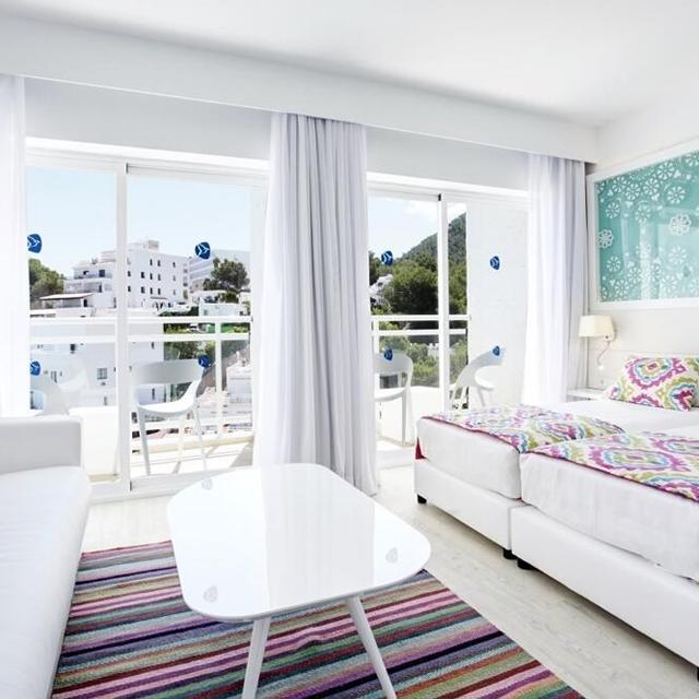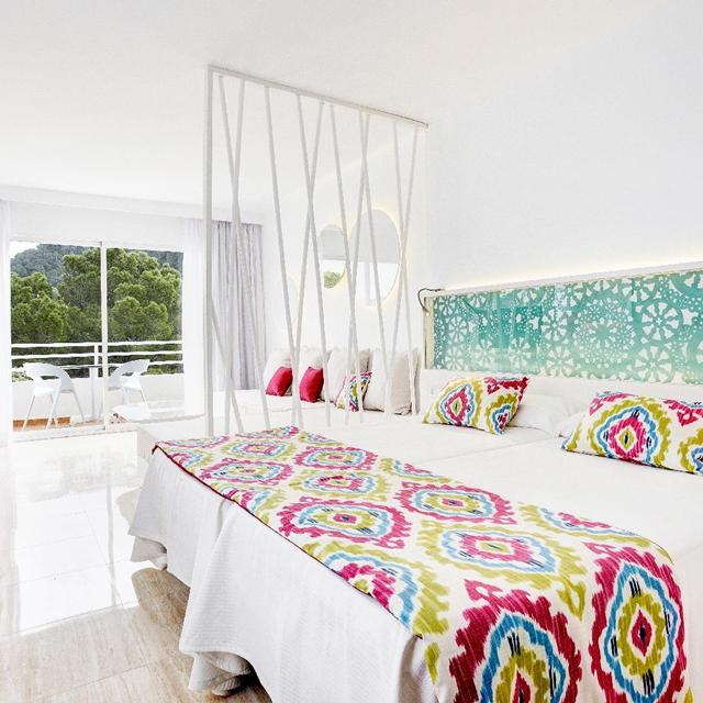 Hotel Grupotel Ibiza Beach Resort – adults only is een 4 sterren accommodatie, warm en stijlvol ingericht. Je verblijft in een comfortabele 8, ingericht met aandacht voor detail. Het bed ligt goed, de ruimte is licht, en het balkon of terras nodigt uit om te blijven zitten.