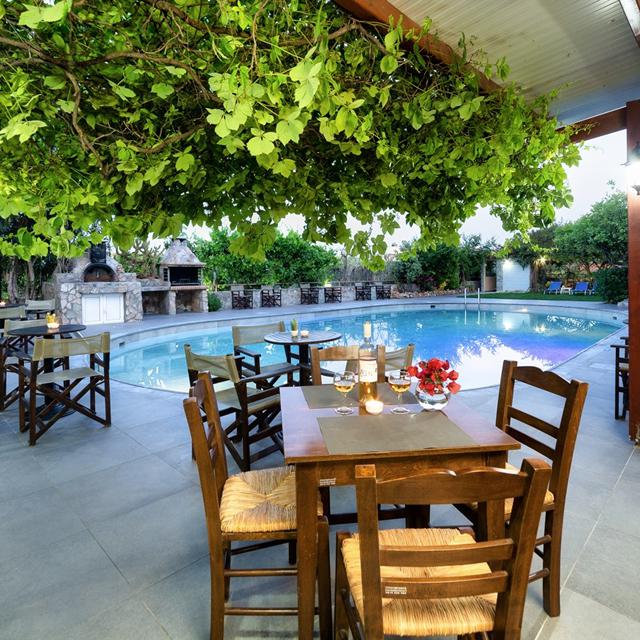 De voorzieningen maken het verblijf compleet. Een verfrissend zwembad, een goed restaurant, lig plekken in de zon, en alles wat je nodig hebt voor een zorgeloze tijd.