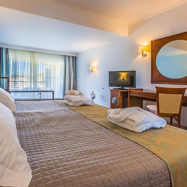 De ruime kamers zijn warm ingericht en voorzien van veel houten meubels. Met uitzichten over het zwembad of de tuin heb je steeds weer zomerse plaatjes. Hierbij zorgen de vele wuivende palmbomen en bloemen voor nog meer sfeer! Ook is het uitgebreide all inclusive programma ideaal; je hebt een ruime keuze Griekse en internationale gerechten in het Amvrosia Meze restaurant. Met name de bijzondere, kleine hapjes zijn uniek te noemen!