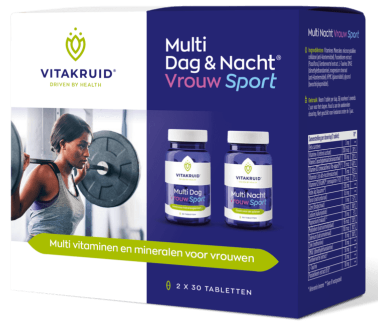 Je weet hoe het gaat. Je wilt goed voor jezelf zorgen, maar soms schiet het erbij in. Drukke dagen, weinig tijd om op alle details te letten, en toch wil je je lichaam geven wat het nodig heeft. Multi Dag & Nacht Vrouw Sport 100% Vegan 2 x 30 van Vitakruid is een voedingssupplement dat jou hierbij ondersteunt. Geen loze beloftes, maar Vitakruid Multi Dag & Nacht Vrouw Sport Tabletten (2×30 stuks) is een combinatie voedingssupplementen. Deze uitgekiende formule voorziet uw lichaam van essentiële voedingsstoffen die specifiek zijn afgestemd op de behoeften van actieve vrouwen, zowel overdag als 's wanneer jij dat kunt gebruiken.