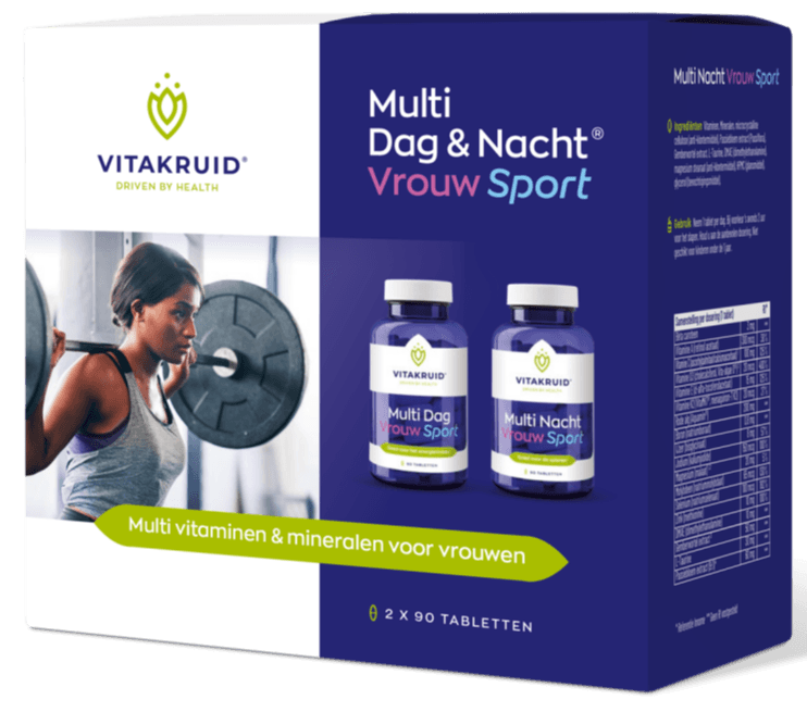 Je weet hoe het gaat. Je wilt goed voor jezelf zorgen, maar soms schiet het erbij in. Drukke dagen, weinig tijd om op alle details te letten, en toch wil je je lichaam geven wat het nodig heeft. Multi Dag & Nacht Vrouw Sport 100% Vegan 2 x 90 van Vitakruid is een voedingssupplement dat jou hierbij ondersteunt. Geen loze beloftes, maar Vitakruid Multi Dag & Nacht Vrouw Sport Tabletten (2×90 stuks) is een combinatie voedingssupplementen. Deze uitgekiende formule voorziet uw lichaam van essentiële voedingsstoffen die specifiek zijn afgestemd op de behoeften van actieve vrouwen, zowel overdag als 's wanneer jij dat kunt gebruiken.