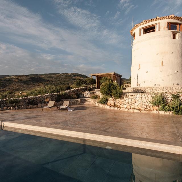 Een zacht briesje streelt mijn haren terwijl ik met blote voeten over het glooiende pad loop. De zon, al aardig laag aan de hemel, kleurt de lucht in tinten oranje en roze. In de verte glinstert de azuurblauwe zee, omzoomd door idyllische baaien en gehuld in een gouden avondlicht. Daar, op een heuveltop, staat ze trots te pronken: Villa Anemomilos, mijn thuis voor de komende dagen. De gepleisterde muren van de molen, ooit gebouwd om kracht uit de wind te halen, ademen nu een serene kracht uit.