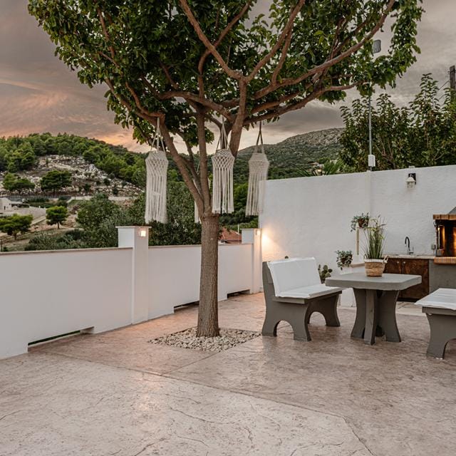 Als ’s avonds de vis op de grill ligt, verwelkom ik Maria en haar man. Zij zijn de eigenaren van Villas Limneon en ik heb ze uitgenodigd voor het eten. Ze vertellen honderduit over de droom die ze hier verwezenlijkt hebben. Ik luister aandachtig en schenk ondertussen de wijn bij. De geur van de vis en kruiden vult de tuin. Genieten! Deze avond mag van mij nog heel lang duren!