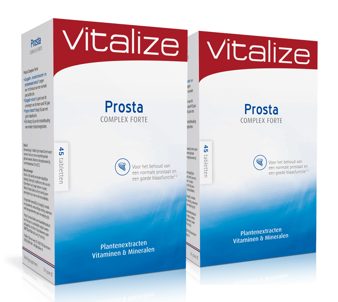Je weet hoe het gaat. Je wilt goed voor jezelf zorgen, maar soms schiet het erbij in. Drukke dagen, weinig tijd om op alle details te letten, en toch wil je je lichaam geven wat het nodig heeft. Vitalize Prosta Complex Forte Tabletten Voordeelverpakking van Vitalize is een voedingssupplement dat jou hierbij ondersteunt. Geen loze beloftes, maar Vitalize Prosta Complex Forte een 100% natuurlijk en hoogwaardig voedingssupplement, speciaal ontwikkeld voor mannen en rijk aan Pygeum, Zaagpalm (saw palmetto) en phytosterol complex. Vitalize Prosta Complex Fortespeciaal voor mannen;met zaagpalm extract;100% natuurlijk wanneer jij dat kunt gebruiken.